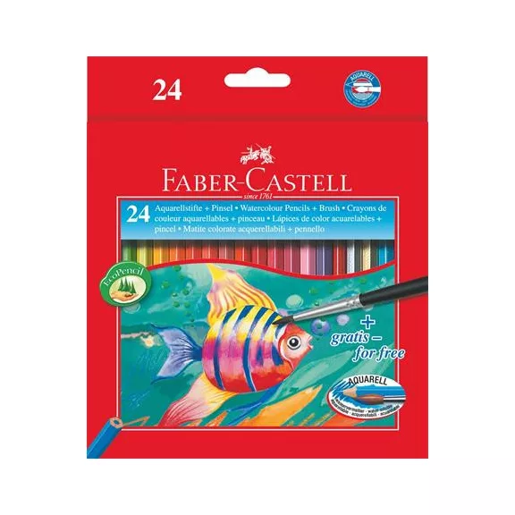 Faber-Castell színes ceruza 24 db-os készlet + ecsettel - Hatszögletű forma - Aquarell, vízoldható ceruza - Speciális kötés a törés megakadályozása érdekében - Ragyogó színek - Átmérő 3,3 mm - Tartozék: Aquarell ecset Gyártó/első EU forgalmazó elérhetősége: A.W. Faber-Castell Vertrieb GmbH Germany, 90546 Stein Nürnberger str.2. info@faber-castell.de www.faber-castell.com