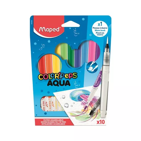 A Color`Peps Aqua filctollakkal új dimenziók nyílnak meg és csodás akvarell rajzokat készíthetünk! -puha ecsethegy a vékony és vastag vonalakhoz egyaránt -ruhából könnyen kimosható tinta -a készletben található vízzel tölthető ecset segítségével gyönyörű akvarell hatás érhető el -hegyátmérő: 2,8 mm -íráshossz: 160 méter