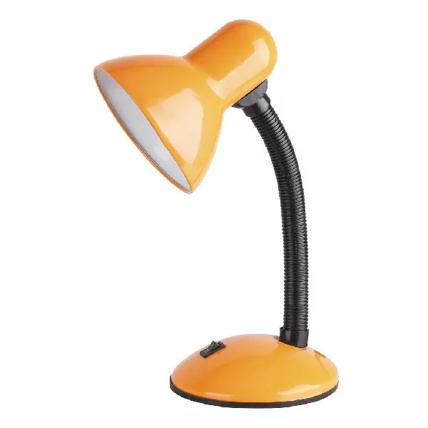 Időtlen megjelenésű asztali lámpa 1 db foglalattal. 23 cm széles, 34,5 cm magas, narancssárga színű műanyag lámpatest és pozícionálható lámpabúra. A lámpatest E27-es foglalatú, max. 40W teljesítményű energiatakarékos fényforrással is használható.