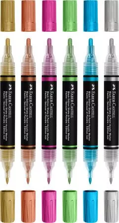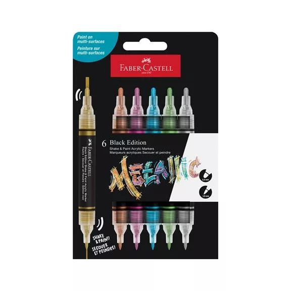 Dekormarker készlet, 1,0/3,0 mm, kétvégű, akril, FABER-CASTELL "Shake&Paint", 6 különböző metál szín