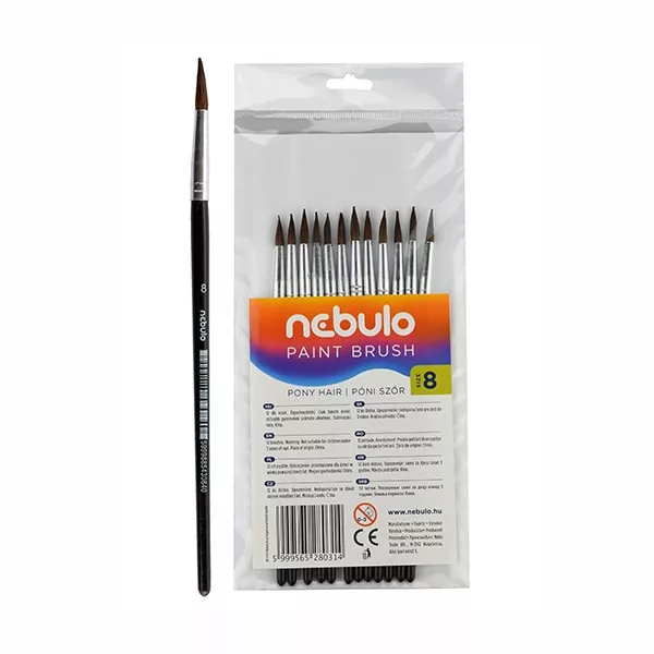 Méretenként csomagolt, festett fanyelű, hegyes, póniszőr körecsetek. A hegyénél vékonyabb, az aljánál pedig vastagabb, így kontrolálható a vonalak vastagsága. Tasakonként 12 db azonos méretű ecset.