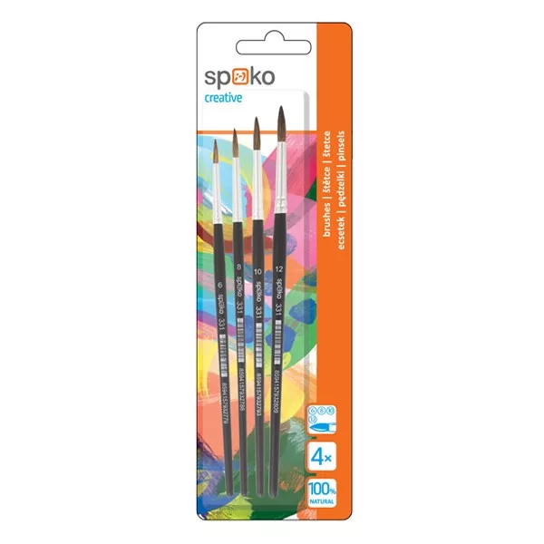 Kerek, természetes szőrű ecsetek készlete iskolásoknak és szabadidős alkotáshoz. Fekete, lakkozott, fa nyél, nyomtatott logóval és mérettel. A krómozott sörtefogó nem korrodál és megtartja a sörtéket ismételt kimosás esetén is.