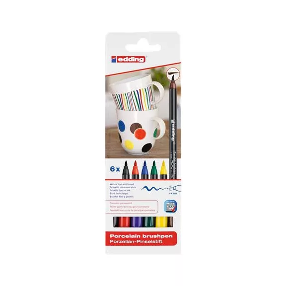 Porcelánmarker ecsetjellegű, hajlékony csúccsal -alkalmas porcelán, kerámia, hőálló üveg felületek dekorálására -vonalvastagság: 1-4 mm -gyorsan száradó festék -nedves törlővel hőkezelés előtt eltávolítható, javítható -sütőben 160 °C-on, 25 percig sütve a dekoráció tartóssá válik -a díszített tárgy a hőkezelés után mosogatógépben is elmosható -színek: sárga zöld, kék, piros, barna, fekete Gyártó/első EU forgalmazó elérhetősége: EDDING INTERNATIONAL GMBH Bookkoppel 7, 22926 Ahrensburg, Germany info@edding.com www.edding.com