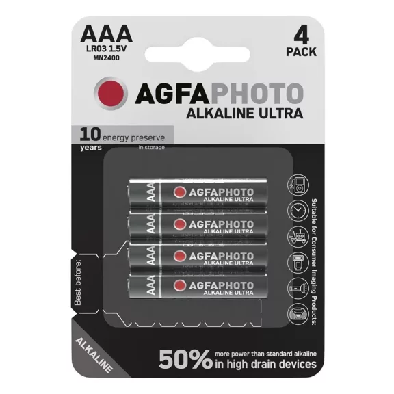 Az Agfaphoto Ultra alkáli elemei a mindennapokban használt hordozható, elektromos eszközeink hosszantartó energiaellátást és stabil működést biztosít, legyen szó zseblámpáról, fürdőszobai kellékekről, távirányítókról, falióráról, gyermekjátékról, vagy akár számítógépes kiegészítőkről. Az Power alkáli elemeinkhez képest 50%-al nagyobb teljesítményt tud nyújtani, ideális nagy fogyasztású készülékekhez. Az Ultra alkáli elemek hosszúéletűek, alacsony a belső ellenállás, így a kevesebb az esély a kisülésre, illetve a szivárgásra, mégis biztosítja a magas hatékonyságot. Az Ultra elemek nem újratölthetők, merülés esetén cserélni kell és a lemerült elemet pedig kizárólag az erre kijelölt tárolókban gyűjtse.