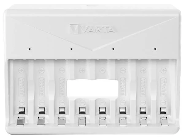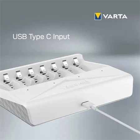 Varta Multi Charger töltő - 8 cella egyidejű töltése. -8 töltőnyílás (páros töltés) -kompatibilis akkumulátorméretek: 2x / 4x / 6x / 8x AA / AAA NiMH -töltőáram: AA: 450mA / AAA: 200mA -jobb töltési idő: 4,5 óra (4x1600mAh AA akkumulátor esetén) -USB C bemenet -tartalmazza az 50 cm-es USB C kábelt a töltő tápellátásához -zöld LED-ek a töltés jelzésére -új, fejlett biztonsági technológiával: Időzítő, mínusz Delta V lekapcsolás, rossz cella - alkáli detektálás, rossz polaritásvédelem, rövidzárlat elleni védelem -csepegtető töltés a legjobb töltési eredményekért -VARTA minőség=megbízhatóság