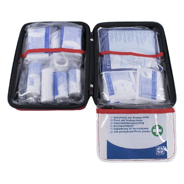 Erős, tartós és könnyű elsősegély táska, helytakarékos formában, hordozófogantyúval, körbefutó cipzárral és átlátszó belső elválasztóval az optimális hozzáférés és az azonnali áttekinthetőség érdekében, DIN 13 157 szerinti GRAMM minőségű tartalommal, minden termék több nyelven felcímkézve és illusztrációkkal ellátva a könnyű használat érdekében.