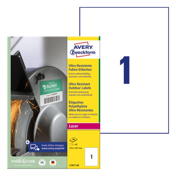 Az Avery Zweckform L7917-40 cikkszámú, fehér, ultra ellenálló film címkéit, lézernyomtatókhoz 210x297 mm méretben kiemelkedően nagy strapabíróság jellemzi, hogy megfeleljen a legmagasabb követelményeknek bel- és kültéren egyaránt. 40 db felületkezelt, matt, rugalmas polietilén címke, 40 íven.