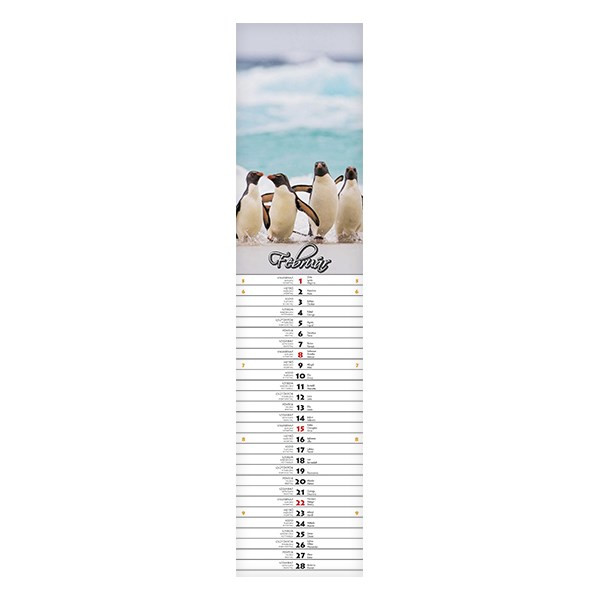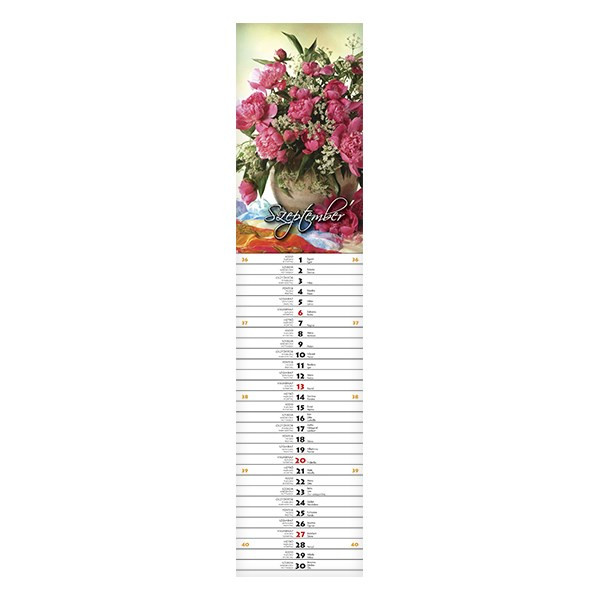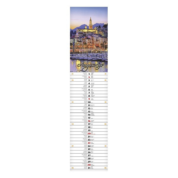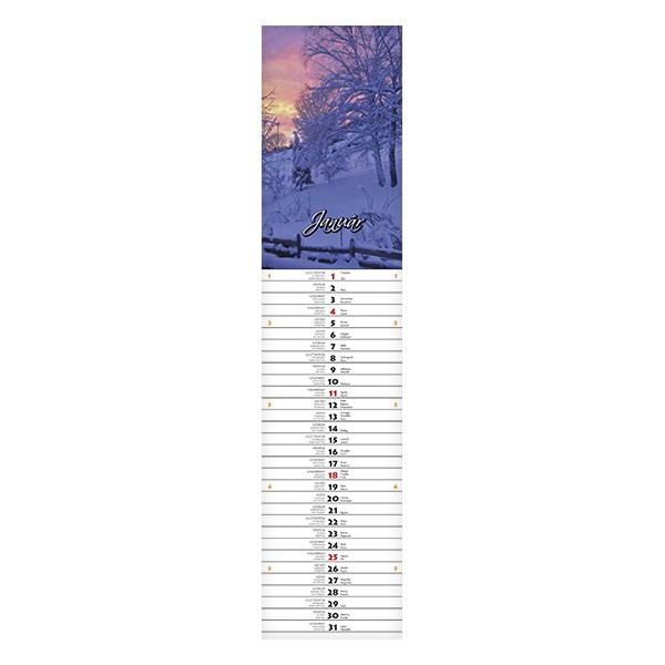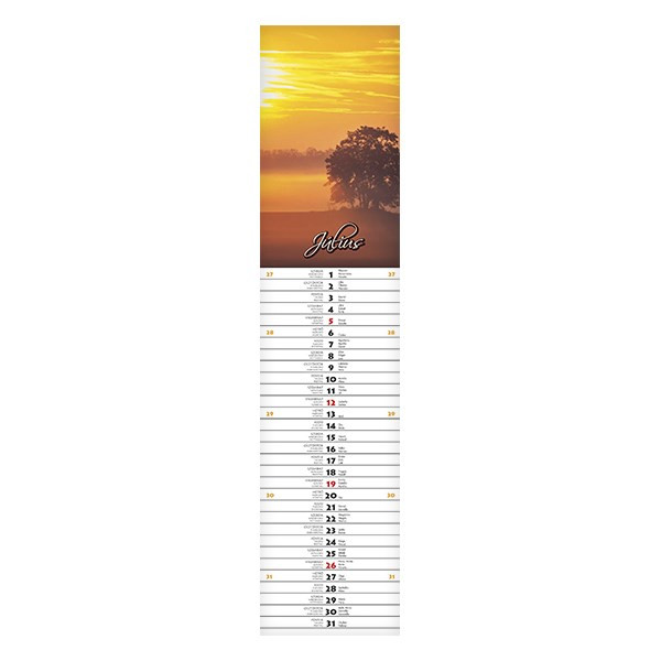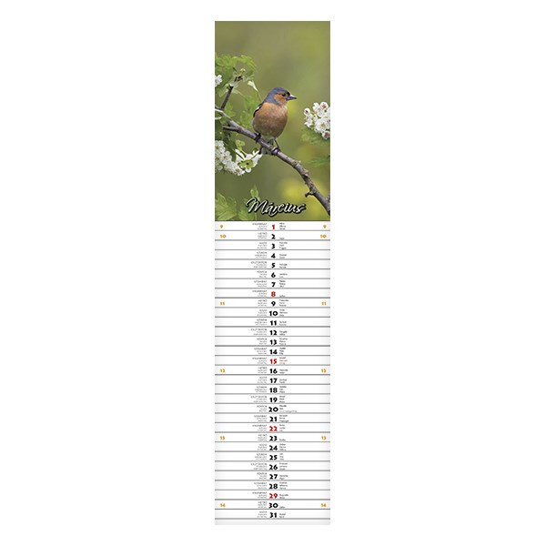 Spirálozott, egyenként fóliatasakban. Naptárrész: magyar, német, angol nyelven, magyar ünnepekkel és névnapokkal. Kivitel: 135 g-os műnyomó, 4 színnyomás, fűzött. Tartalom: 12 lap+ borító+ képösszefoglaló+ hátkarton. Méret: 110x480mm.