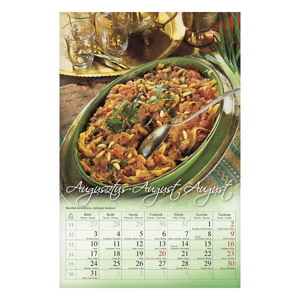 Naptárrész: magyar, német, angol nyelven, magyar ünnepekkel és névnapokkal, napkelte, napnyugta és a holdállás feltüntetésével.