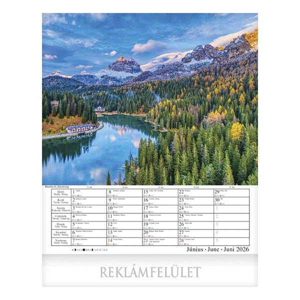 Naptárrész: magyar, német, angol nyelven, magyar ünnepekkel és névnapokkal, napkelte, napnyugta és a holdállás feltüntetésével.