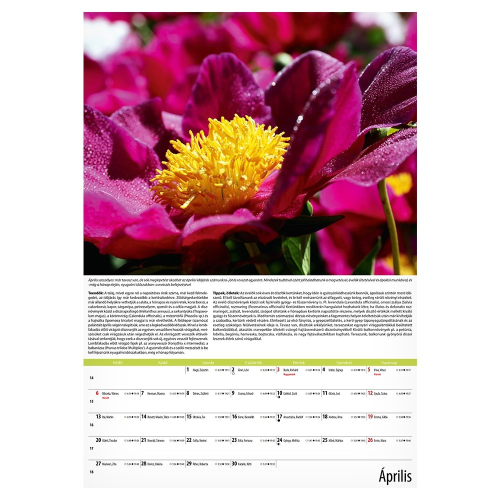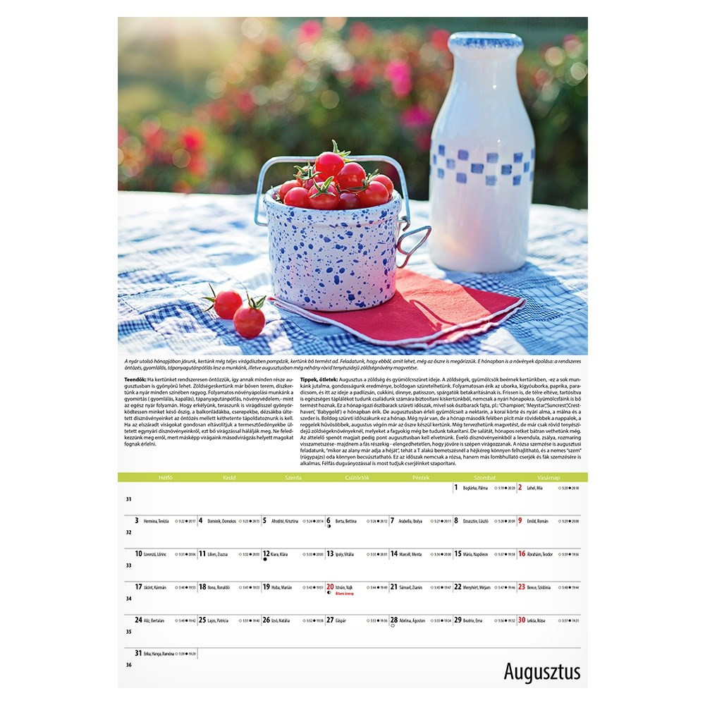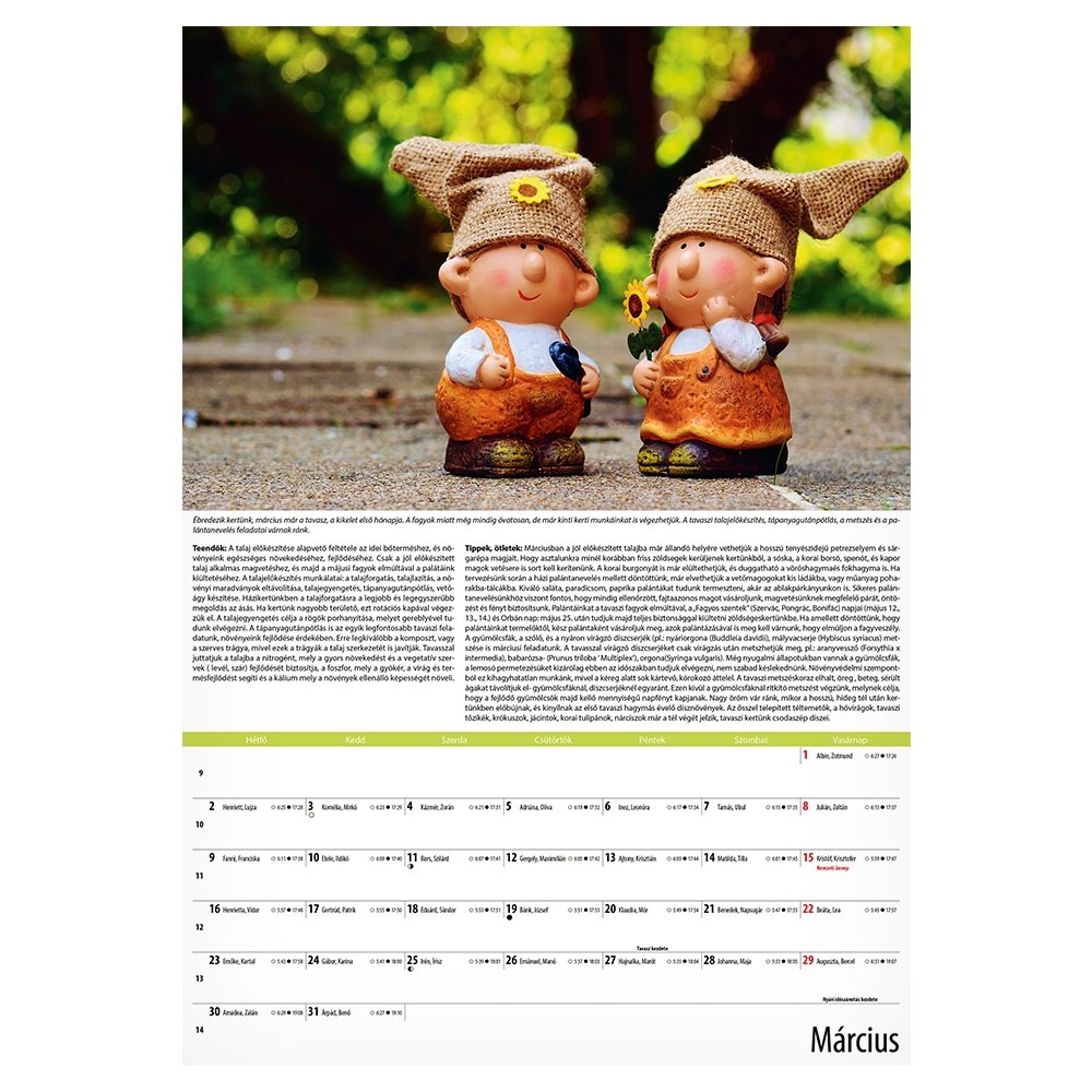 13 lapos, 460x320 mm, Magyar naptárhálóval, magyar névnapokkal.