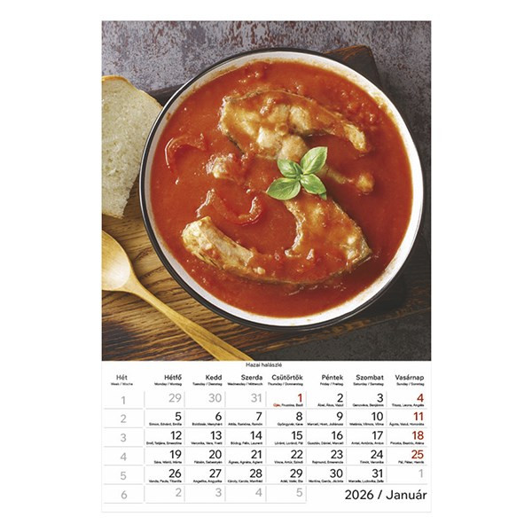 13 lapos, 220x330 mm, Magyar naptárhálóval. Reklámfelület: 220x50 mm. Szitanyomással és présfóliával emblémázható.