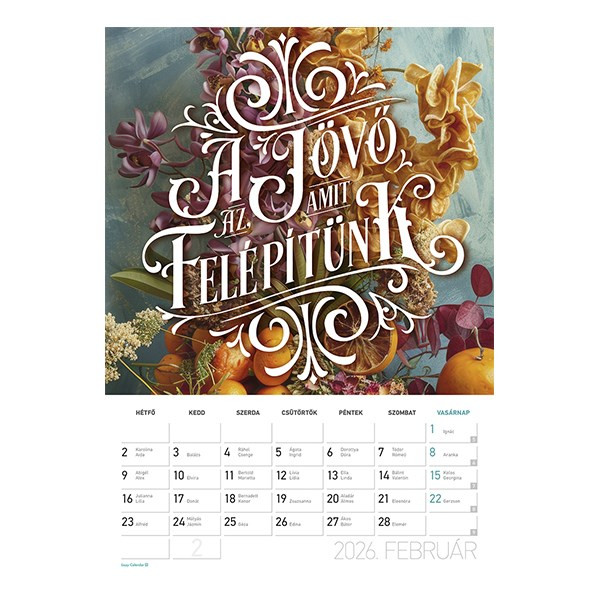B4 méretű (álló formátum), spirálozott képes falinaptár, 12 hónap, ünnepekkel, névnapokkal, fém akasztóval, 235x330 mm
