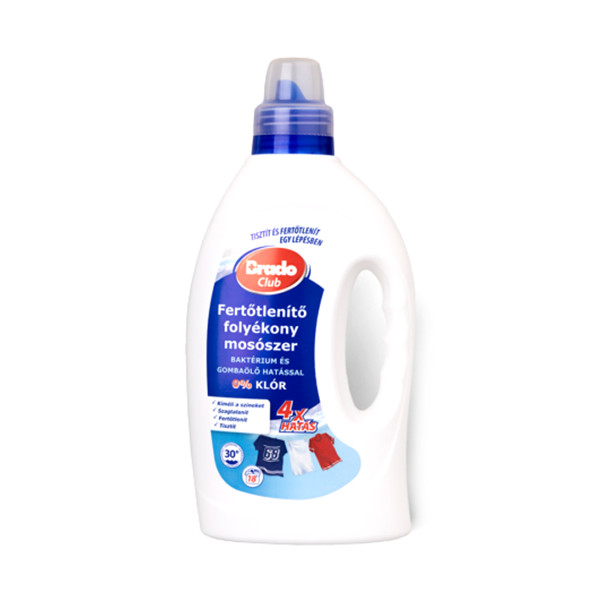 Bradoclub fertőtlenítő folyékony mosószer baktérium és gombaölő hatással.