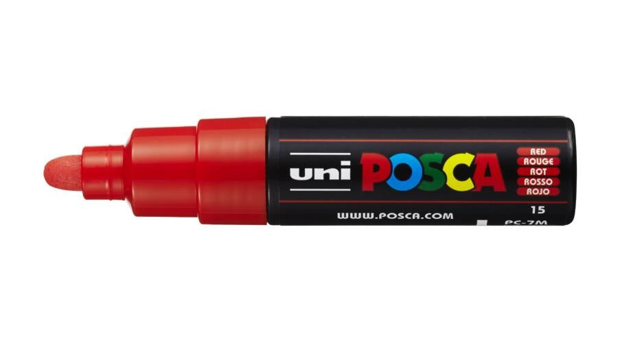 Dekormarker, kreatív marker. Iskolai, művészi és ipari területen használható eszköz. Vízbázisú, nagy fedőképességű festék. Felhasználható: textil, fa, üveg, műanyag, papír, porcelán, fém, bőr és különféle ásványi eredetű anyagokra. Egészségre ártalmatlan, vegyi oldószermentes tinta. Száradás után víz és UV álló. Tinta színe: piros. Hegyvastagság: 4,5-5,5 mm, kerek.