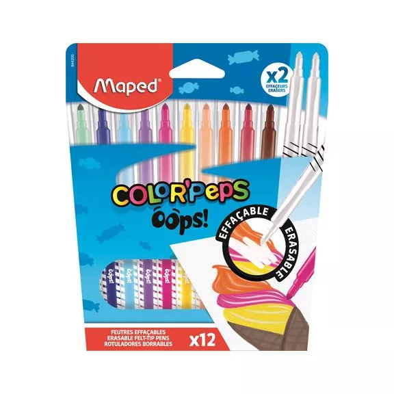 Az OOPS törölhető filctollakkal külön élmény az alkotás, hiszen a hibák könnyedén eltűntethetők, de akár egyedi rajzok is készíthetők velük. -rajzoláshoz és színezéshez egyaránt alkalmas, törölhető filctollak -élénk színek -kúpos hegy -vonalvastagság: 3,6 mm -nyomásnak ellenálló hegy -megfelel a biztonságos használatra vonatkozó szabályoknak -íráshossz: 350 méter -a készlet 10 különböző színű és 2 tintaeltávolító filctollat tartalmaz