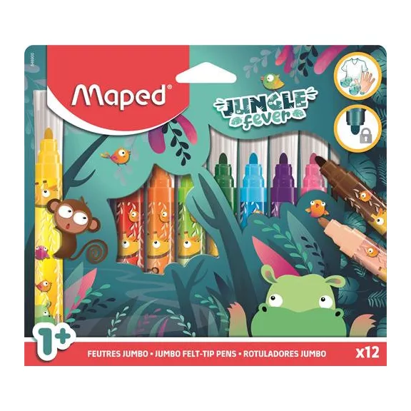 A "Jungle Fever" termékeit a Maped kifejezetten a legkisebbek számára fejlesztette, vidám mintájuk gyorsan a kicsik kedvenceivé válnak. Teljes termékválasztékával minden eszköz adott az alkotáshoz. -kifejezetten kisgyermekek számára kifejlesztett, vastag (jumbo) filctollak a könnyű fogásért -élénk színek -vidám állatmintákkal díszített tolltest -ruhából könnyen kimosható, vízbázisú tinta -nyomásnak ellenálló hegy -vonalvastagság: 5 mm -íráshossz: 250 méter -ajánlott kor (év): 1+