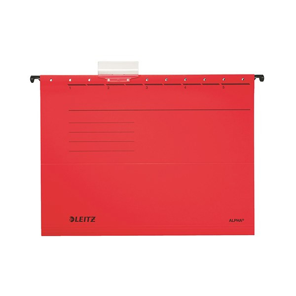 Függőmappa LEITZ Alpha Standard. Kiváló minőségű nyitott függőmappa. Fém fülek. Méret: A/4 Alapanyag: 210 gr-os karton, 100% újrahasznosított. Laminálással megerősített gerinc. Több színben. Víztiszta, műanyag címketartó, 6 cm hosszú. Változtatható címkeállás. Fehér címke 100%-ban újrahasznosított kartonból. Fesztávolság: 330 mm. Blue Angel minősített. Kiszerelés: 25 db / doboz.