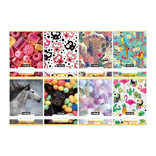 A/5-ös tűzött iskolai sima füzet, 32 lapos (20-32). 16 db füzet (8 különböző cuki minta, azaz 2db/minta) van egy csomagban. 70 g-os füzetlapok és 200 g-os műnyomó borító fényes fóliával.