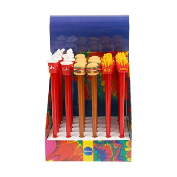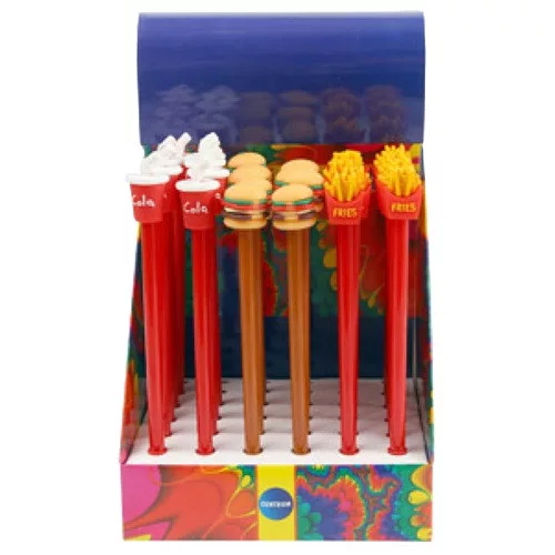 hamburgert, sült krumplit és kólás poharat mintázó eldobható golyóstoll
