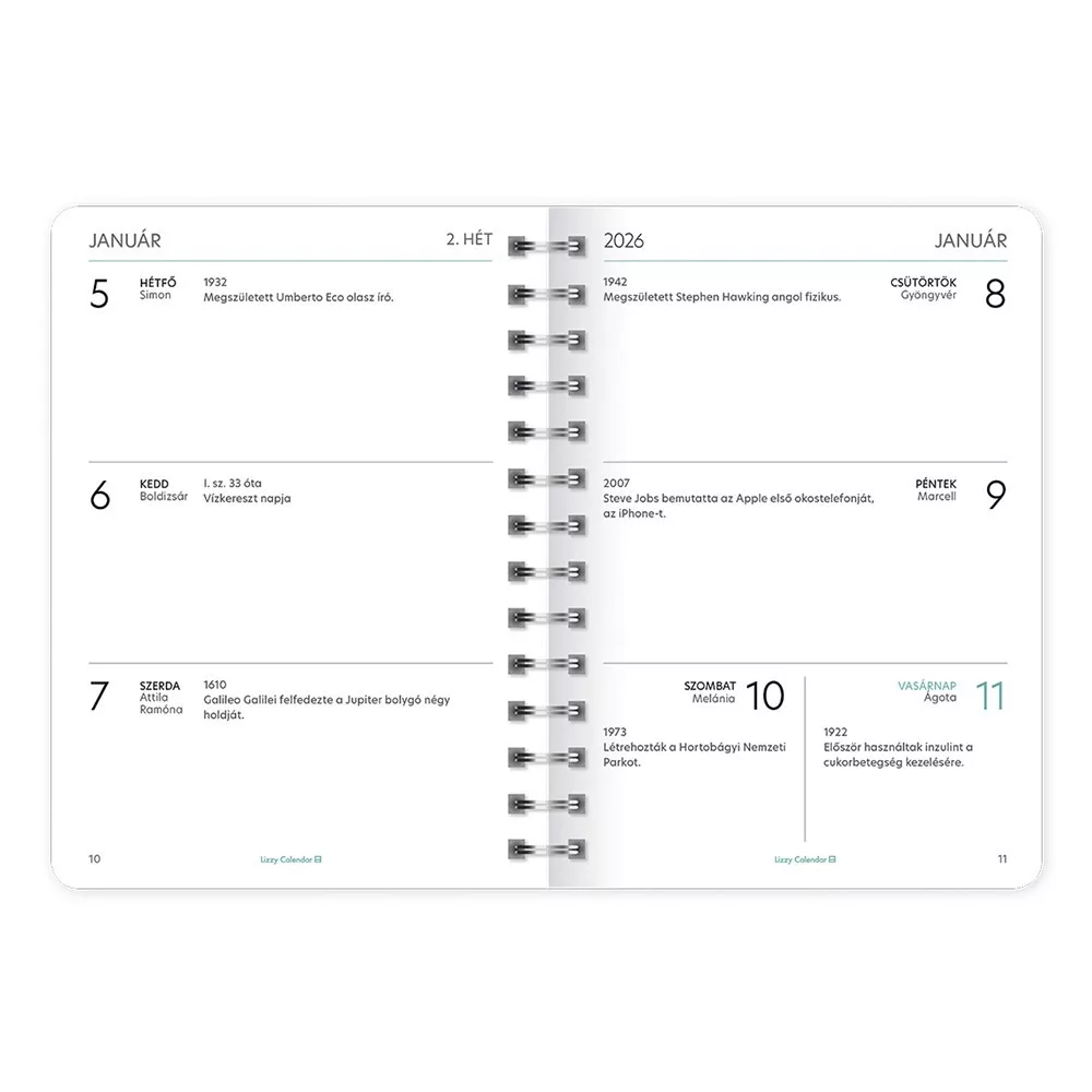 B6 méretű, spirálozott, gumipántos, heti tervező naptár, matrica oldallal, 128 oldal, 120x166 mm