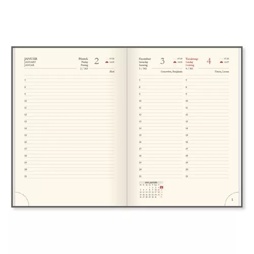 • Oldalszám: 352 oldal – 16 információs oldal, 320 naptároldal, jegyzetek, telefonregiszter, 2027. januári tervező