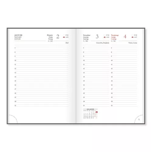 • Oldalszám: 352 oldal – 16 információs oldal, 320 naptároldal, 2027. januári tervező, jegyzetek, telefonregiszter