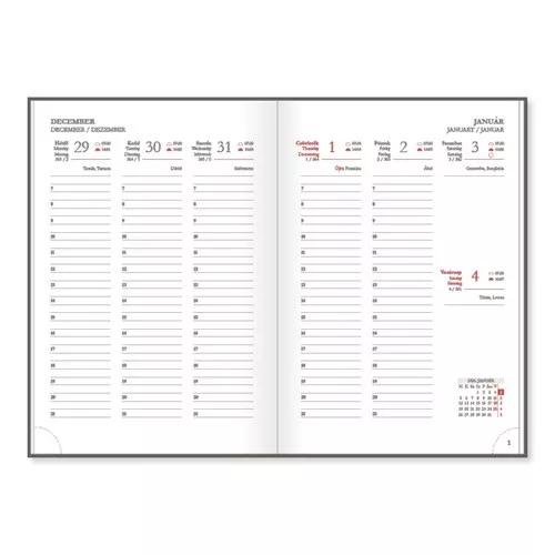 - Oldalszám: 140 oldal – 16 információs oldal, 112 naptároldal, jegyzetek, telefonregiszter, 2027. januári tervező