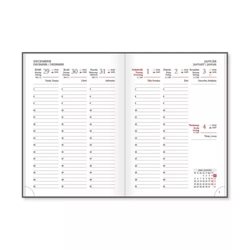 • Oldalszám: 140 oldal – 16 információs oldal, 112 naptároldal, jegyzetek, telefonregiszter, 2027. januári tervező