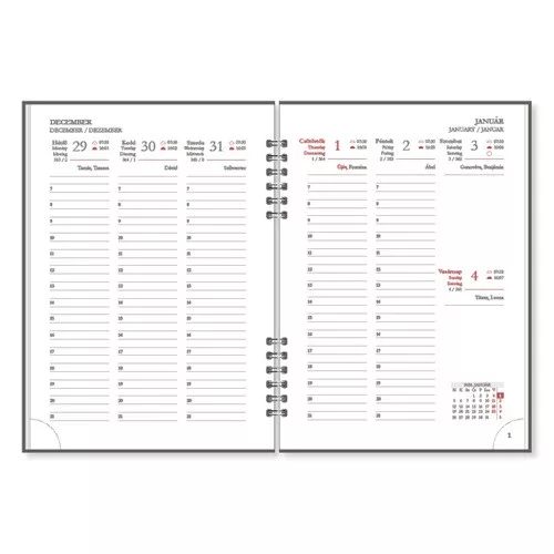 A Period ECO A/5 heti, spirálos határidőnapló azoknak készült, akik a praktikus heti áttekintést letisztult, természetes hatású borítóval párosítanák. A spirálkötés síkra nyitható, könnyen visszahajtható használatot ad, a 7–21 órás, félórás beosztás pedig precíz munkaidős tervezést tesz lehetővé. A sarokperforáció gyors tájékozódást biztosít a mindennapokban.