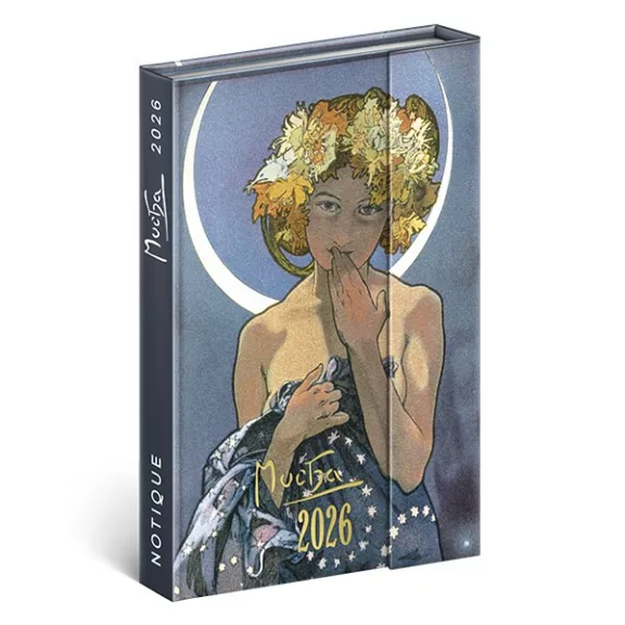 Határidőnapló mágnessel záródó REALSYSTEM 110x160mm heti sárga lapos Alphonse Mucha 2026.