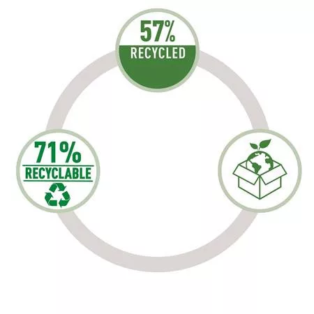 -a termék teljesen szétszedhető a különböző anyagtípusokra, 71%-ban újrahasznosítható; műanyagmentes csomagolásban