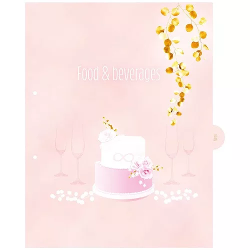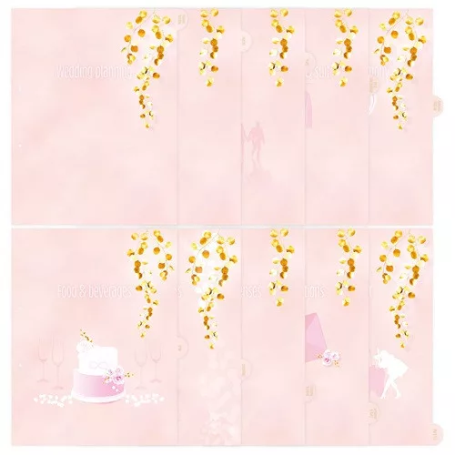 Az illusztrált elválasztólapokon minden megtalálható, ami a tervezéshez fontos: helyszín, vendéglista, esküvői menü, dekoráció és még sok egyéb.