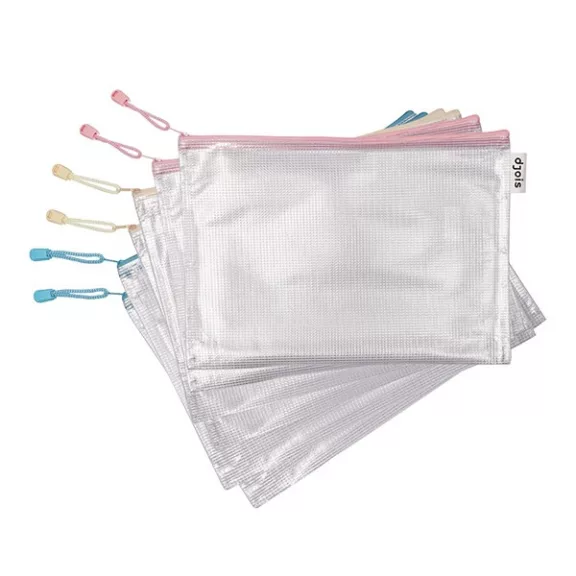 Rendkívül tartós, félig átlátszó, rugalmas hálóval erősített, tartós PVC tasak vonzó, pasztell színekben. Dokumentumok, írószerek, apró tárgyak akár tematikus rendszerezésére is alkalmas. A fém cipzáron lévő, színes zsinór megkönnyíti a használatot. Oldalán található, logós hurok toll tartására alkalmas. Formátuma: A4, külső mérete: 240 × 330 mm; tetején cipzárral. Anyaga: hálóval erősített, tartós PVC (230 µm) Pasztell színek vegyesen: sárga, rózsaszín, kék. Szakadásbiztos, REACH-kompatibilis, ftalát mentes. Szín nem választható!