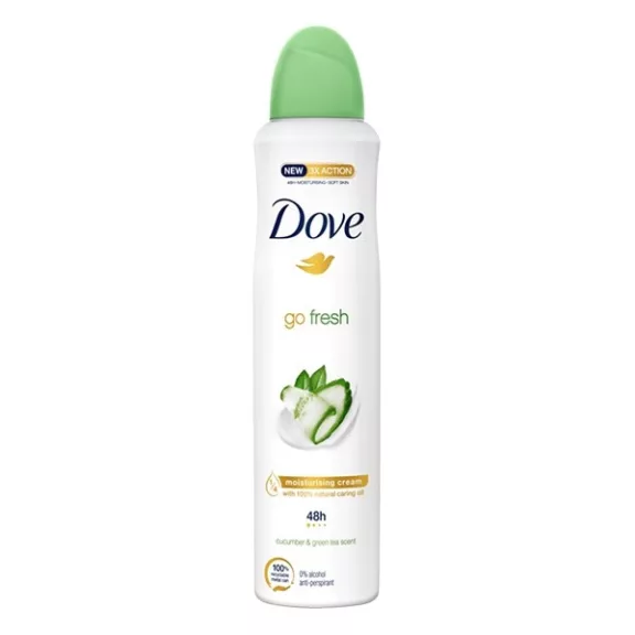 A Dove Go Fresh uborka és zöld tea illatú női izzadásgátló aeroszol már a legelső fújástól kezdve hatékony. 48 órás izzadásgátló hatása segít megőrizni magabiztosságodat, hiszen biztosan nem hagy cserben. Alkoholmentes és 1/4 rész hidratálókrémet tartalmaz, hogy ne csak védjen az izzadástól, de ápolja is a hónalj érzékeny bőrét.