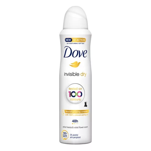 Szeretsz élénk színeket viselni, de nem szeretnél fehér foltokat találni a ruháidon? A Dove Invisible Dry női izzadásgátló aeroszol az első olyan izzadásgátló, amelyet 100 színen teszteltünk, hogy ne hagyjon foltokat. Viseld bátran színes ruháidat, hiszen a fehér foltok miatt nem kell aggódnod.