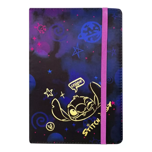 Erős, karton alapú, párnázott borítású jegyzetfüzet lapos gumiszalagos záródással. Külső borítása ellenáll a kisebb sérüléseknek, karcolódásoknak. Fehérített, vonalas lapokkal és egy kis Stitch díszítéssel a lapok jobb alsó sarkában. Használhatjuk mindennapi jegyzetekhez, napi feladatokhoz vagy naplóként egyaránt.