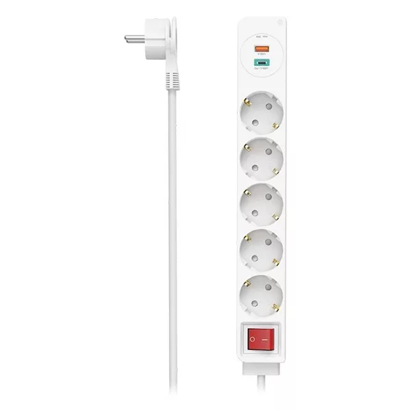 Kábel hosszabbító HAMA 5 aljzat + USB-C/USB-A 1,4m kapcsolóval fehér