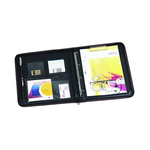 Műbőr, zippzáras záródású A/4-es méretű Fortuna konferencia mappa, 30 mm gerinszélességgel, belül praktikus tárolózsebekkel és lefűzhető felírótáblával ellátva.