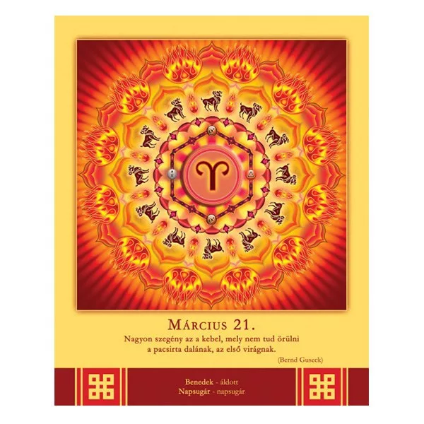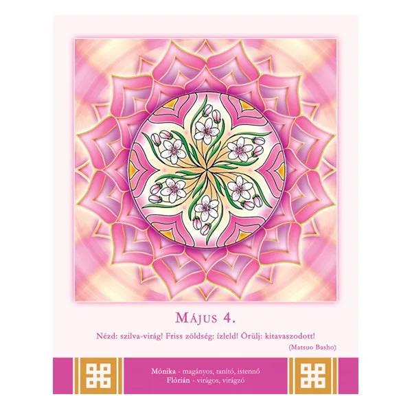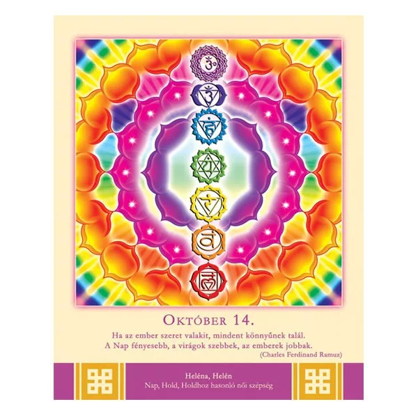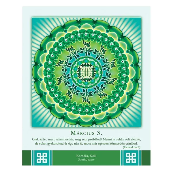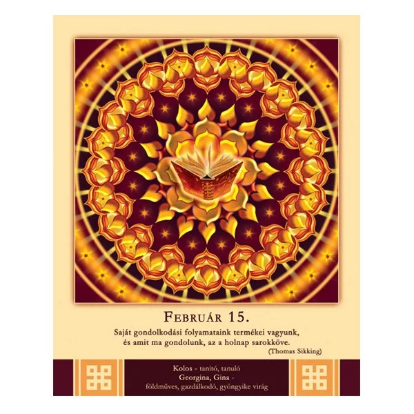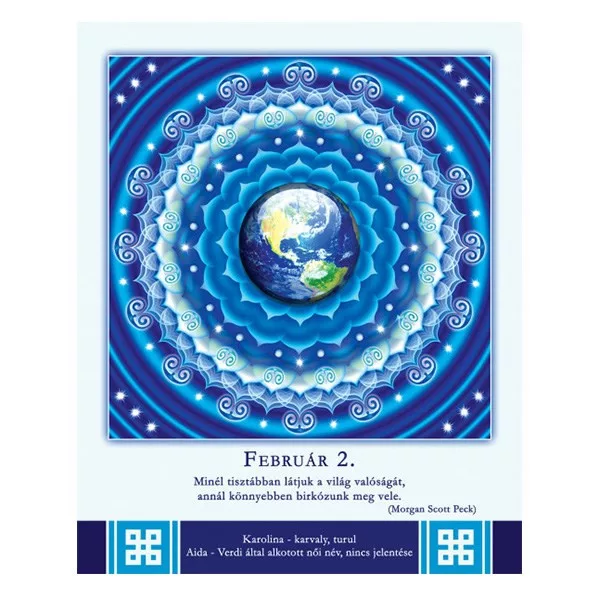 366 oldalon újabb és újabb, gyönyörű színű és formájú, energiát adó mandalát talál az év minden napjára. A képeket az adott naphoz illeszkedő bölcs útravaló és a névnapok jelentése gazdagítja.