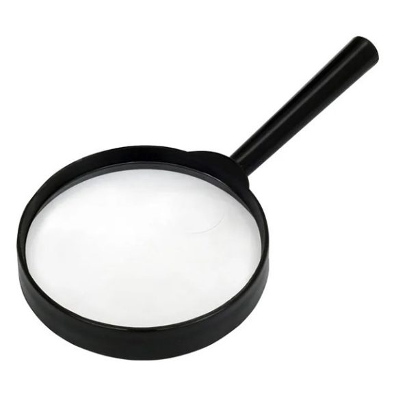 Műanyag keretes kézi nagyító, 5-szörös nagyítás. Fogantyús, torzításmentes üveg, átmérő: 75 mm