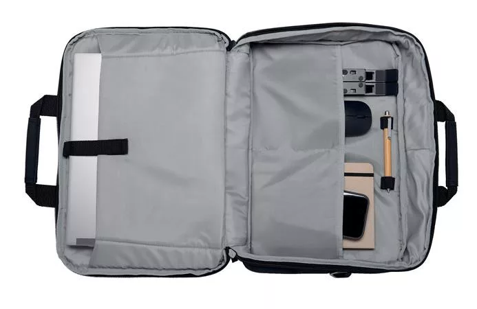 Az EQ laptop laptop táska ideális megoldás olyan professzionális felhasználók számára, akik megfizethető, fenntartható anyagokból készült, utazóbarát táskát keresnek. Ez a táska 52%-ban fogyasztás után újrahasznosított (PCR) poliészterből készül 23 x 250 ml-es műanyag palack újrahasznosításával. Modern és utazóbarát hordtáska, mely párnázott rekesszel rendelkezik és akár 16”-os laptopok (beleértve a 15,6”-os notebookokat is) hordozására is alkalmas. A cipzáras elülső rekesz és a több zseb könnyű hozzáférést biztosít a mappákhoz és a tartozékokhoz. Párnázott vállpánt a nyak és a váll kényelméért, rögzítőpánt guruló poggyászhoz való egyszerű rögzítéshez. A teljesen szétnyitható kialakítás leegyszerűsíti a biztonsági átvizsgálást. -23 x 250 ml-es műanyag palack újrahasznosításával készült -akár 16"-os laptopokhoz (beleértve a 15,6"-os notebookokat is) -modern, teljesen szétnyitható kivitel -belső párnázott rekesz laptop számára -gurulós bőröndre erősíthető -hely mappák és tartozékok számára -elülső cipzáras rekesz -2 év korlátozott garancia