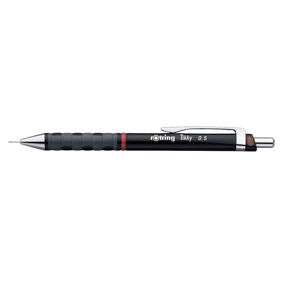 Nyomósiron 0,5mm Rotring Tikky fekete. Könnyűsúlyú nyomósiron gumírozott fogórésszel. Ergonómikus háromszögletű test végződés, amely egyedi designt és gyakorlati praktikusságot biztosít felhasználójának. Lágy tapintású gumírozott fogórész a nagy kényelemért. Újratölthető, magas polimerű HB 0,5 mm-es heggyel töltve. Beépített radír a nyomógomb kupak alatt. Fekete testszín.