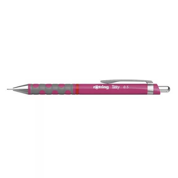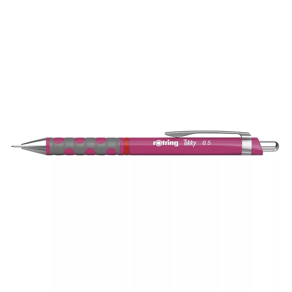 Nyomósiron 0,5mm Rotring Tikky magenta. Könnyűsúlyú nyomósiron gumírozott fogórésszel. Ergonómikus háromszögletű test végződés, amely egyedi designt és gyakorlati praktikusságot biztosít felhasználójának. Lágy tapintású gumírozott fogórész a nagy kényelemért. Újratölthető, magas polimerű HB 0,5 mm-es heggyel töltve. Beépített radír a nyomógomb kupak alatt. Magenta testszín.