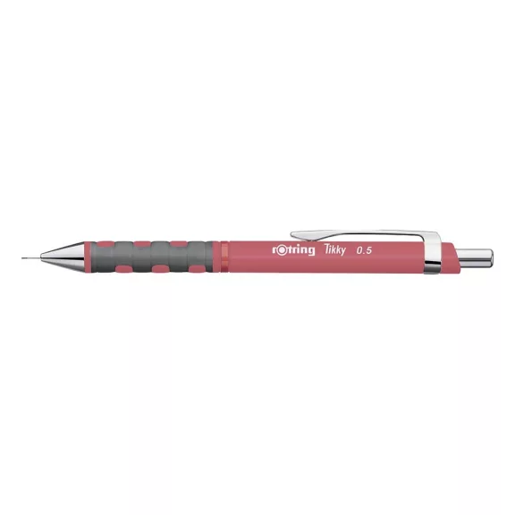 Nyomósiron 0,5mm Rotring Tikky tearózsa. Könnyűsúlyú nyomósiron gumírozott fogórésszel. Ergonómikus háromszögletű test végződés, amely egyedi designt és gyakorlati praktikusságot biztosít felhasználójának. Lágy tapintású gumírozott fogórész a nagy kényelemért. Újratölthető, magas polimerű HB 0,5 mm-es heggyel töltve. Beépített radír a nyomógomb kupak alatt. Tearózsa testszín.