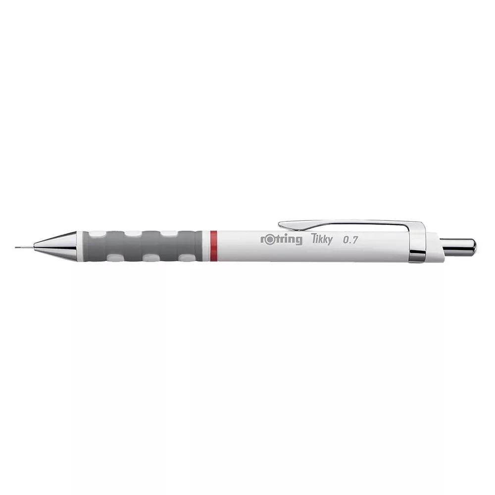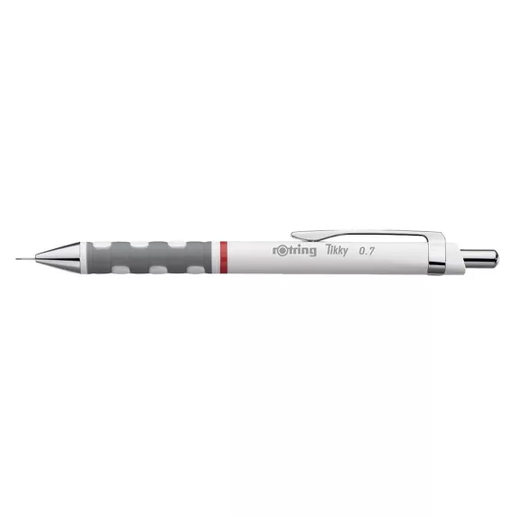 Nyomósiron 0,7mm Rotring Tikky fehér. Könnyűsúlyú nyomósiron gumírozott fogórésszel. Ergonómikus háromszögletű test végződés, amely egyedi designt és gyakorlati praktikusságot biztosít felhasználójának. Lágy tapintású gumírozott fogórész a nagy kényelemért. Újratölthető, magas polimerű HB 0,7 mm-es heggyel töltve. Beépített radír a nyomógomb kupak alatt. Fehér testszín.