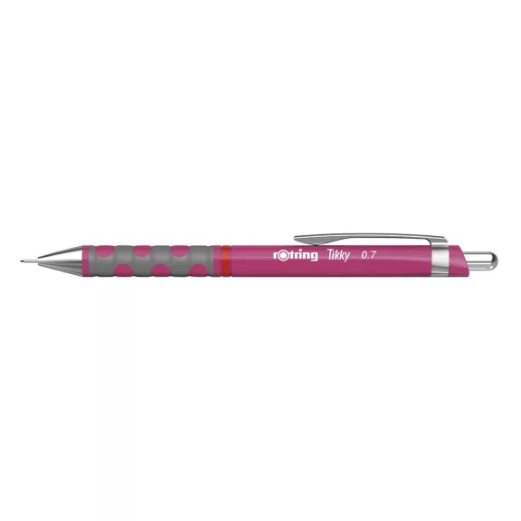 Nyomósiron 0,7mm Rotring Tikky magenta. Könnyűsúlyú nyomósiron gumírozott fogórésszel. Ergonómikus háromszögletű test végződés, amely egyedi designt és gyakorlati praktikusságot biztosít felhasználójának. Lágy tapintású gumírozott fogórész a nagy kényelemért. Újratölthető, magas polimerű HB 0,7 mm-es heggyel töltve. Beépített radír a nyomógomb kupak alatt. Magenta testszín.