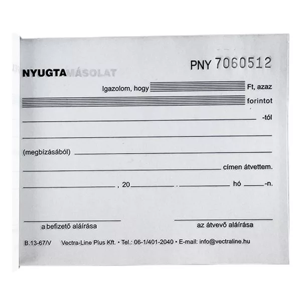 Átvételi elismervény. A/6 méretű, fekvő, 50 lapos, 3 példányos. Minőségi belívvel, karton fedlappal rendelkező nyomtatvány. Tartós tűzött kötéssel és perforációval rendelkezik. Kiszerelés: 40 db/csomag.