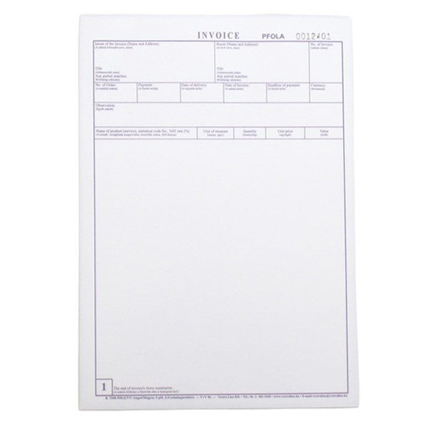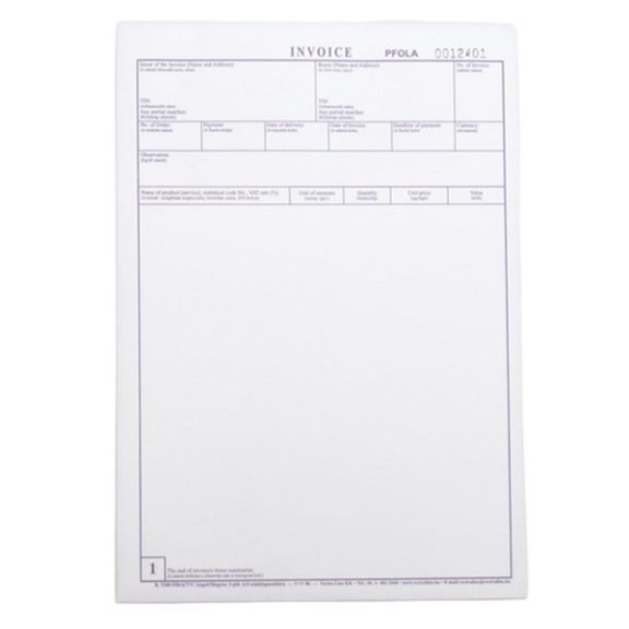 Deviza számla, angol. A/4 méretű, álló, 5 példányos, 2007 angol. Kiszerelés: 200 ív/csomag. Szigorú számadású nyomtatvány.