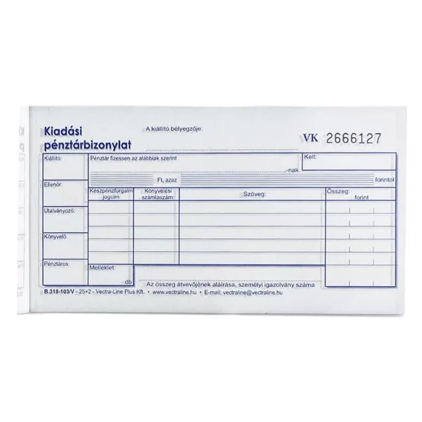 Kiadási pénztárbizonylat. Fekvő, 25x 2 példányos. Minőségi belívvel, karton fedlappal rendelkező nyomtatvány. Tartós tűzött kötéssel és perforációval rendelkezik. Kiszerelés: 40 db/csomag.